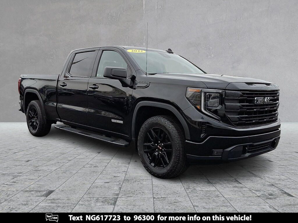 The 2022 GMC Sierra 1500 Elevation in Onyx Black is a bold capable full-size pickup engineered for performance utility and advanced technology. With its Crew Cab and Standard Box 4WD configuration this truck is built for both work and lifestyle versatility. Powered by a 2.7L Turbo High-Output engine mated to an 8-speed automatic transmission it delivers reliable strength and smooth handling. The exterior is elevated by 20"gloss black aluminum wheels and 6"black assist steps while the interior is packed with comfort and convenience features like heated front seats dual-zone climate control and a leather-wrapped heated steering wheel. Advanced tech includes a 13.4"touchscreen with Google built-in wireless Apple CarPlay/Android Auto and a premium infotainment system. Safety is prioritized with GMC Pro Safety features and a HD rear vision camera. Whether navigating city streets or tackling rugged terrains this Sierra 1500 Elevation blends functionality with a commanding presence.**Key Features & Specifications:****Make:** GMC**Model:** Sierra 1500 Elevation**Model Year:** 2022**Exterior Color:** Onyx Black**Interior Color:** Jet Black**Engine:** 2.7L Turbo High Output**Transmission:** 8-Speed Automatic**Drivetrain:** 4WD (Crew Cab Standard Box)**Exterior Features:*** 20"Painted High Gloss Black Aluminum Wheels* 6"Black Assist Steps (Dealer Installed)* Spray-On Bedliner* All-Terrain Tires* LED Headlamps Fog Lamps Taillamps & Cargo Lighting* EZ Lift Power Lock & Release Tailgate* GMC MultiPro Tailgate* Power Adjustable Heated Mirrors* CornerStep Rear Bumper* 12 Fixed Cargo Tie Downs* Rear-Window Defogger**Interior Features:*** Heated Front Seats* Heated Leather-Wrapped Steering Wheel* Dual Zone Climate Control* Rear HVAC Vents* Front 40/20/40 Bench Seat with Underseat Storage* Rear 60/40 Folding Bench Seat with Storage Package* Manual Tilt & Telescoping Steering Column* Carpeted Floor Covering**Technology & Connectivity:*** 13.4"Color Touchscreen with Google Built-In* Wireless Apple CarPlay & Android Auto* 12.3"Digital Driver Information Center* Remote Start & Keyless Open* SiriusXM Capable* OnStar & Wi-Fi Hotspot Capable* USB Ports* Theft-Deterrent System* Rear Seat Reminder**Safety & Driver Assistance:*** GMC Pro Safety Suite: * Automatic Emergency Braking * Forward Collision Alert * Lane Keep Assist with Lane Departure Warning * Front Pedestrian Braking * Following Distance Indicator * IntelliBeam Auto High Beam* HD Rear Vision Camera* Teen Driver Mode* Tire Pressure Monitoring with Tire Fill Alert* Brake Pad Monitoring**Performance & Towing:*** Auto Locking Rear Differential* Autotrac Transfer Case with Terrain Mode* 220 Amp Alternator* Stabilitrak with Trailer Sway Control & Hill Start Assist* Trailering Package* GVWR 7000 lbs* Rear Axle Ratio: 3.42GMC Certified Pre-Owned Details: * 24 months/24000 miles (whichever comes first) Certified Pre-Owned Scheduled Maintenance Plan and 3 days/150 miles (whichever comes first) Vehicle Exchange Program. SiriusXM 3-month trial subscription * Vehicle History * Warranty Deductible: $0 * 172 Point Inspection * Transferable Warranty * Roadside Assistance * Limited Warranty: 12 Month/12000 Mile (whichever comes first) from certified purchase date * Powertrain Limited Warranty: 72 Month/100000 Mile (whichever comes first) from original in-service date